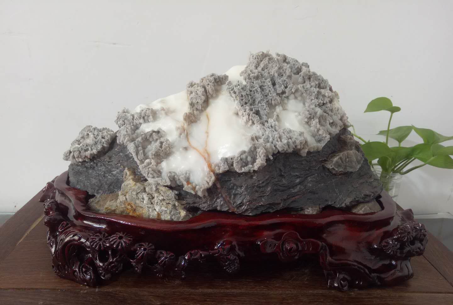 灵璧白灵石《纳福迎吉》 人道石道以石悟道,人性石性以石养性!白灵石色泽洁白,温润如玉,梅雪同春,吉祥平安,灵气十足醇厚古朴的原始风貌,又有造化神奇的俏丽英姿吉祥山形石,观其秀丽,望则俊伟,最适宜办公家居摆设。其特点:山前有容凹形天池,此为聚财。主峰凸出,饱满大方,寓意靠山,石来运转!