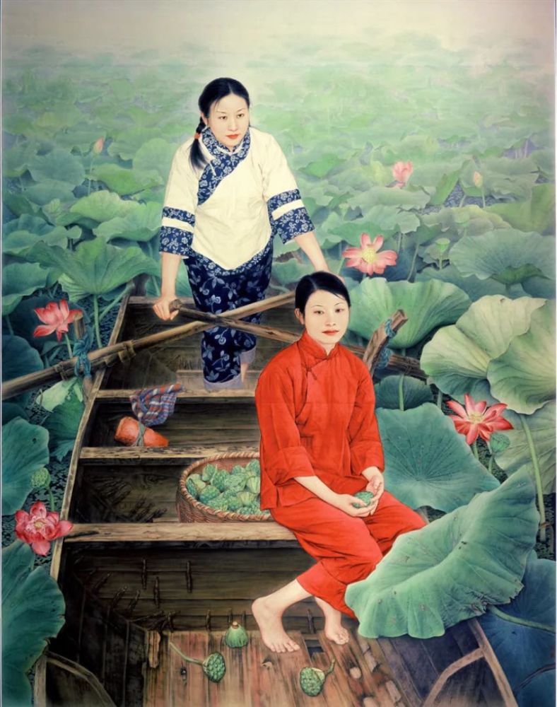 《红莲》是李乃蔚又一幅匠心独运之作,历时4年才破茧而出。在这个漫长的创作过程中,他依然沿用纯正中国画颜料和勾勒渲染的技巧,方寸之地常常渲染几十遍甚至上百遍,并在经年累月的时间跨度中逐渐沉淀出自己对于物性的情感和认识。他成功地将这种薄透的水性设色转化为表现力极为丰富和细微的艺术语言,从而改变了工笔人物画在形象塑造上概念而不深入、修饰而缺乏真实感的审美范式。在这幅作品中,他把中国画颜色发挥到了极致,让画面色调呈现极为丰富细微的冷暖变化,把洪湖鲜艳欲滴的荷花和由近及远的薄雾,构成淡然悠远、亦真亦幻梦幻般的水乡。作品《红莲》脱颖而出,入选第四届北京国际双年展并被挂置中国美术馆显著的第四位展出,当几位来自古老国度印度的艺术家,看到这幅设色薄而透并具有欧洲古典写实油画那样细微与深入的极致写实工笔画时惊叹不已,热切地找到李乃蔚了解询问绘画的技法。这让他们感受到这不仅是中国工笔画极致写实之美,还有中国文化的博大精深。